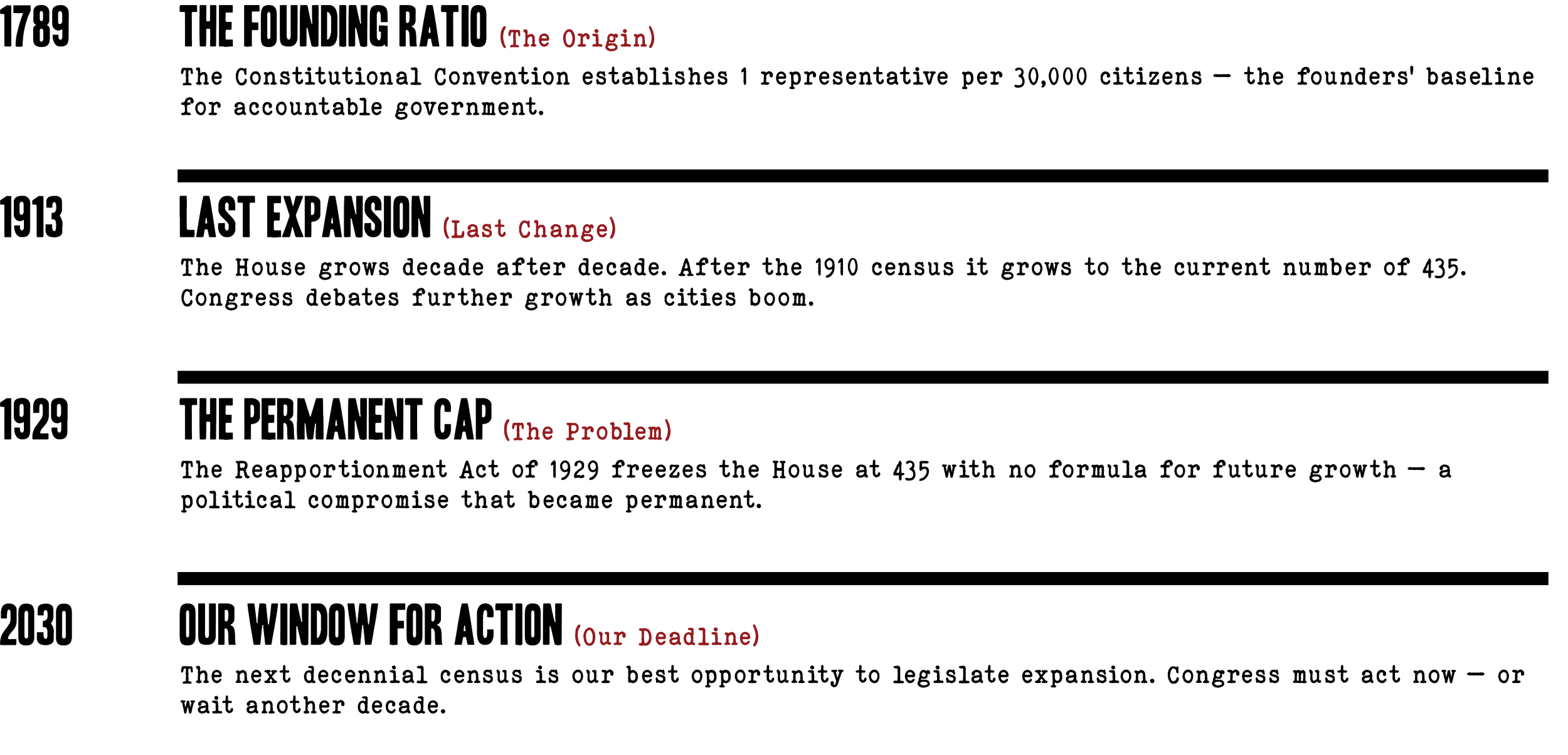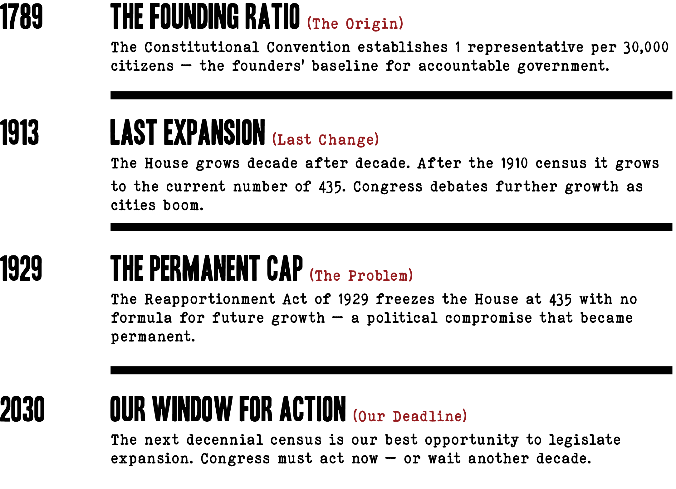 In 1929, Congress arbitrarily froze the House at 435 seats. The population has since tripled. The result: a House disconnected from the people it was built to serve.